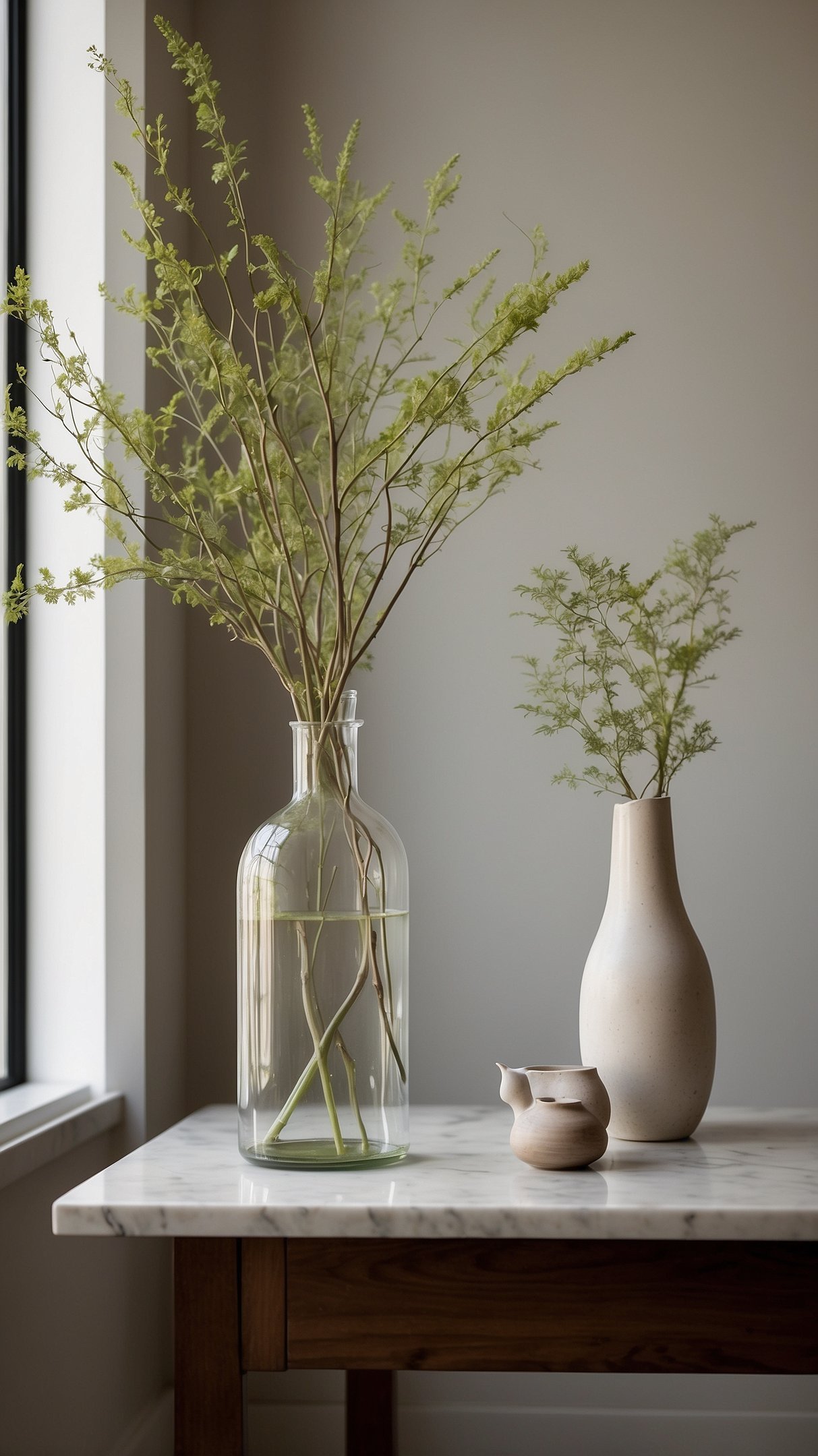 • Small plants or branches: A single potted plant or a branch in a narrow vase brings life and a touch of spring without demanding much space.