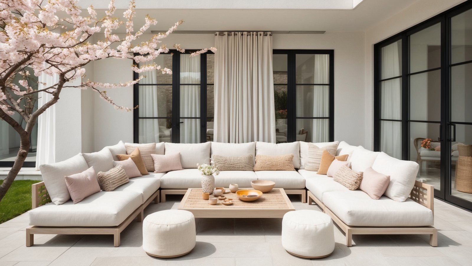 • Soft textiles: Use outdoor rugs and throws in muted tones—think warm beige, soft gray, or sage—to layer texture while keeping the palette serene and cohesive with Spring decor.