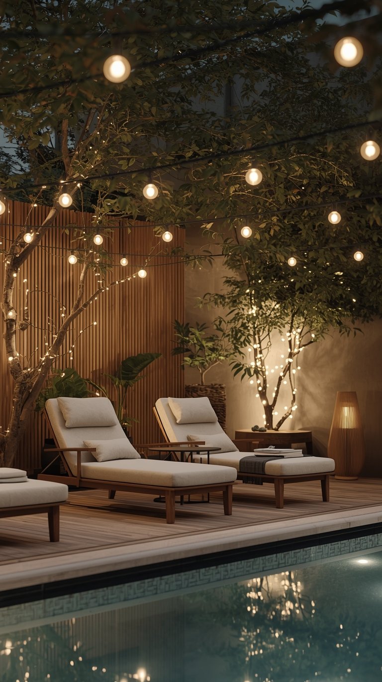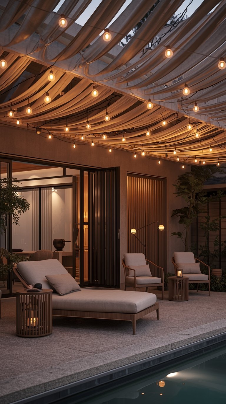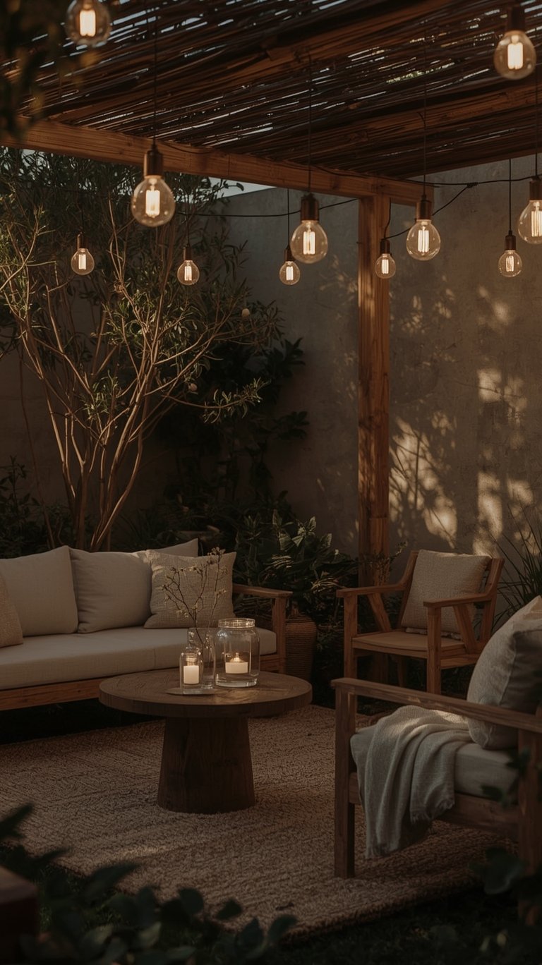 Don’t be afraid to mix different textures in your outdoor space. Pair the sleekness of metal outdoor string lights with the warmth of wooden furniture and the softness of linen cushions. This creates depth and visual interest, making your oasis feel rich and inviting. It’s all about tactile harmony, especially in Japandi garden lighting and wabi-sabi garden lighting.