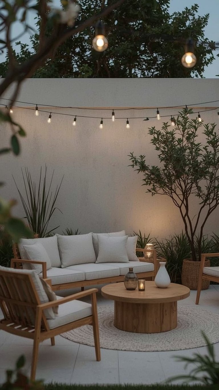 Want to create a truly magical outdoor room? A string light canopy is the answer. Run multiple strands from a central point outwards, or crisscross them across the entire space. It feels like dining under a blanket of stars, adding an incredibly romantic and chic touch to any evening. This is a fantastic outdoor string lights idea.